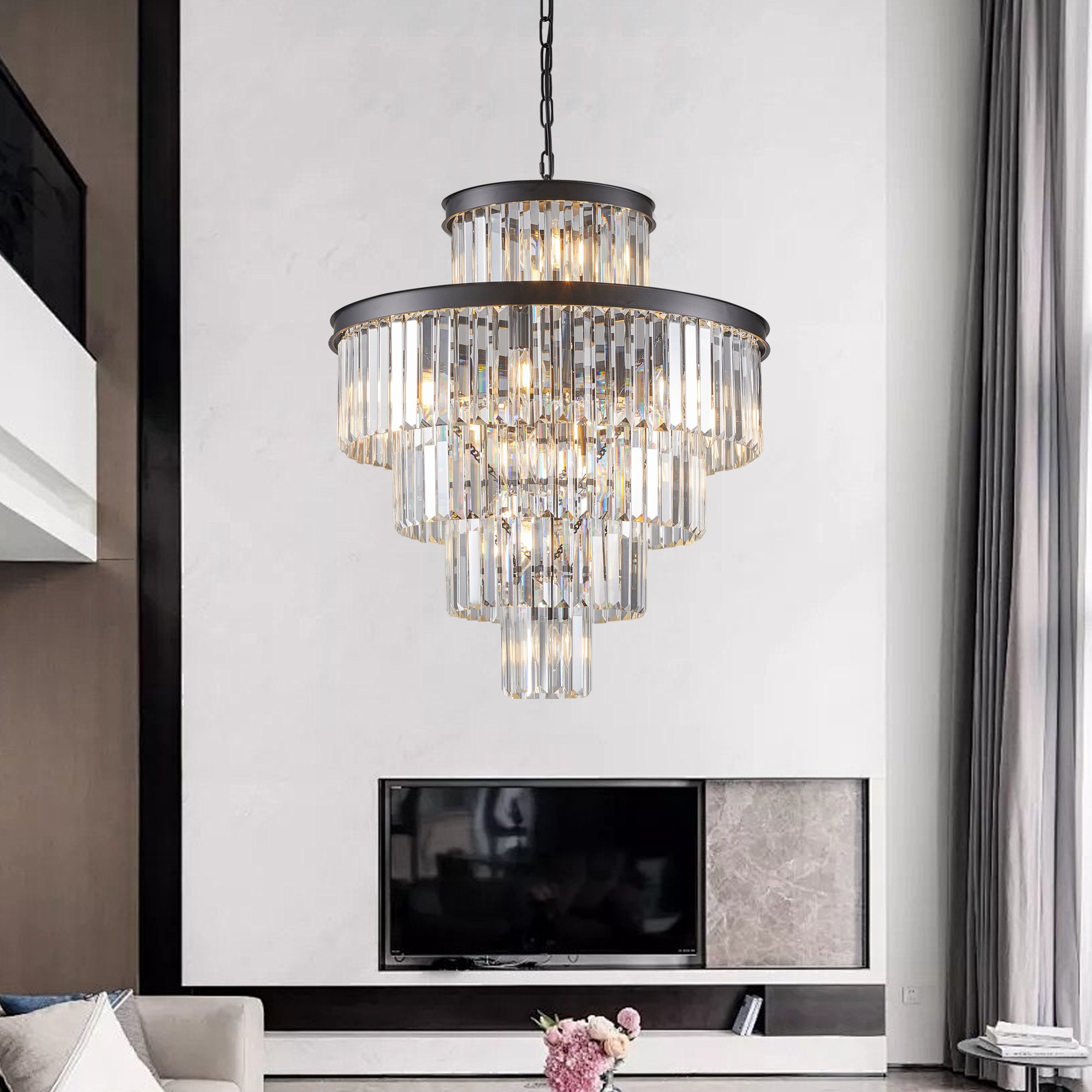 23.6 Inches Black Luxury Crystal Chandelier23.6 Inches Black Luxury Crystal Chandelier:Composed of premium K9 crystals and black finish metal base, clear crystal prisms on large round iron chrome finished frames. Total of 5-tier sparkling crystals. Luxurious and contemporary design, perfect for home decor which will make your house look stunning. Size : Width 23.6" x Height 27.6" .Please ensure dimensions of this crystal chandelier light fixture is fit for your prepared space or not. Bulb Requirement:This crystal pendant light need 15 x E12 bulbs (Max 60-watt, This product does not contain a light source) .Ideal Indoor Decoration: This Modern luxury style chandelier is perfect for wide application, kitchen island, living room, dining room, enterway, hallway, foyer, corridor, stairway, bars, cafes, hotels, and restaurants, etc.