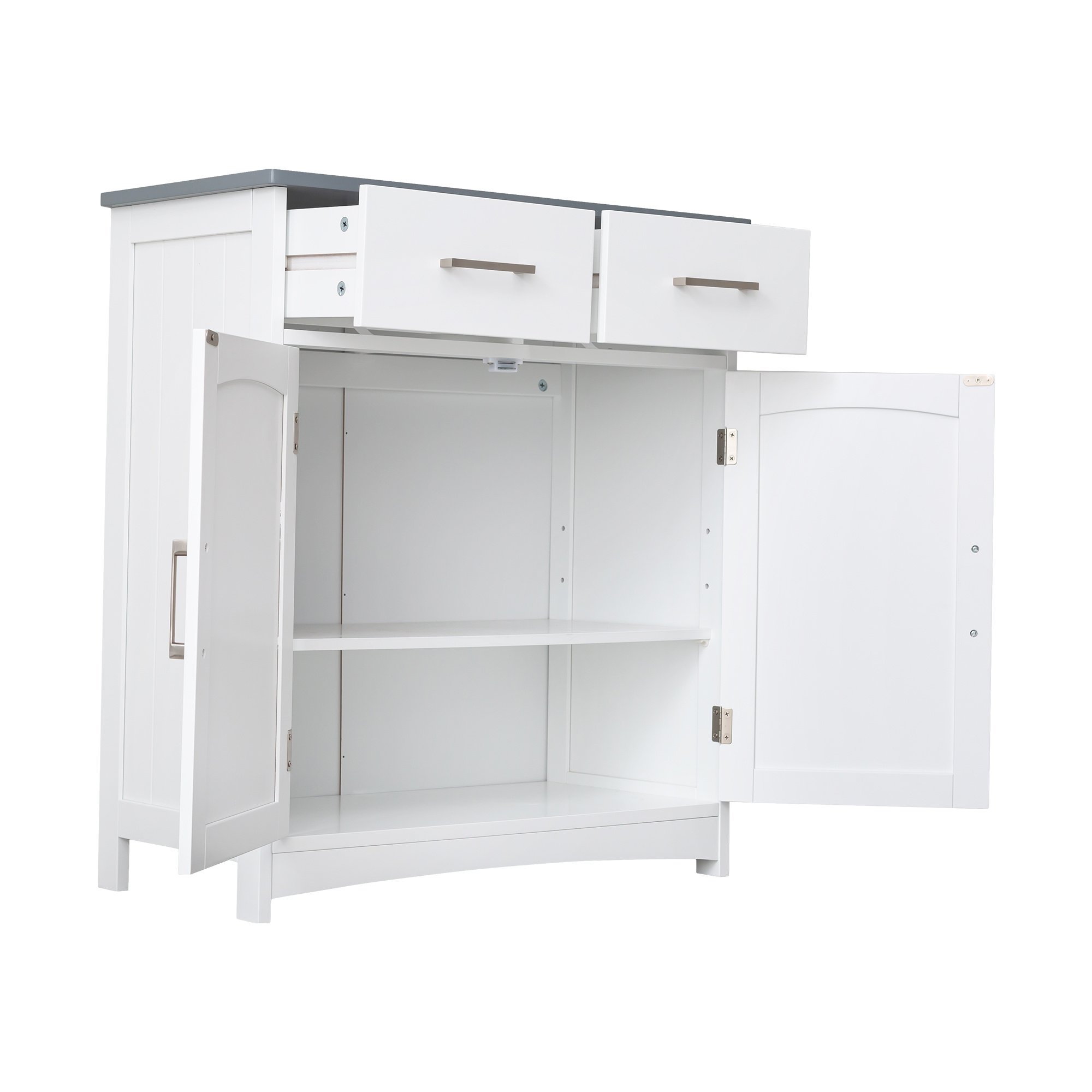 This buffet cabinet with storage features a grey top plate and a matte white finish, perfect for any home. The drawers and doors have double-hole metal handles for easy access, while the wooden guide rails with an anti-drop design ensure smooth drawer operation. The door includes an inner arc design and three pull cords for added convenience. Inside, a movable shelf with three-speed adjustment offers flexible storage. Two anti-dumping holes with iron hooks secure the cabinet, and the 180-degree full-open hinges, door stopper, and suction make the doors easy to use. Ideal as a coffee bar or sideboard buffet cabinet.