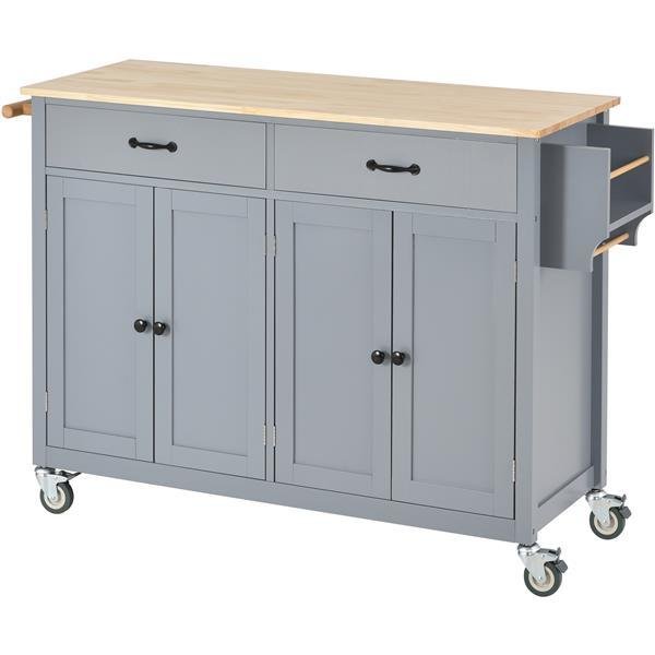 Kitchen Island Cart with 4 Door Cabinet and Two Drawers and 2 Locking Wheels - Solid Wood TopThe Kitchen Island Cart with Solid Wood Top and Locking Wheels is an essential addition to any kitchen. This versatile cart features a 4 door cabinet with an adjustable shelf, providing ample storage space for pots, pans, and other kitchen essentials. Two roomy drawers offer additional storage for utensils, towels, and more. The solid wood top provides a durable and spacious work surface for preparing food, while the built-in spice rack and towel rack keep your kitchen organized. The cart rests on four sturdy wheels, two of which are locking, ensuring stability and mobility as you move the cart around your kitchen. The frame of this cart is made from solid wood, ensuring durability and longevity. The paint coating on this cart protects it from everyday wear and tear, while its mint green color will add a pop of color to any kitchen decor.AMPLE STORAGEWith a 4 door cabinet and two spacious drawers, this cart provides ample storage space for your kitchen essentials.SPICE & TOWEL RACKKeep your spices and towels organized and within easy reach with the built-in spice rack and towel rack.Specifications:ColorWhite/Black/Grey Blue/Mint GreenMaterialSolid wood and MDFSuggested Number of People2Estimated Time to Assemble40-60 minutesProduct Care1.Wipe with a soft dry cloth. Avoid the use of harsh chemicals and household cleaners as they may damage the finish. 2.Hardware may loosen over time; periodically check that all connections are tight.- [AMPLE STORAGE] With a 4 door cabinet and two spacious drawers, this cart provides ample storage space for your kitchen essentials.- [SOLID WOOD TOP] The solid wood desktop provides a durable and spacious work surface for preparing food and other kitchen tasks.- [ADJUSTABLE SHELVES] Customize the interior of the cabinet according to your needs with the adjustable shelves that can be moved up or down to accommodate various items.- [SPICE & TOWEL RACK] Keep your spices and towels organized and within easy reach with the built-in spice rack and towel rack.- [TWO LOCKING WHEELS] The two locking wheels ensure stability and mobility, allowing you to move the cart around your kitchen as needed while keeping it securely in place.Notice:1.Real Product's Color may be a little different from the image due to the lighting or monitor's display.2.Manual measurement has been used, there may be some reasonable error.Tabletop Weight Capacity:16 LBS;Shelf Weight Capacity:5 LBS.Overall Product Dimensions 54.33 x 18.5 x 36.22 inches