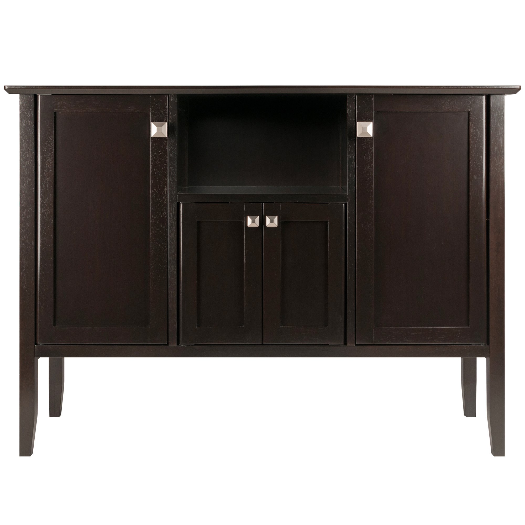 Dress up your dining area; living room or entryway with the Winsome Wood Melba Buffet Cabinet. Smart and elegant; this cabinet features 2 single-door cabinets and an open shelf; plus a center cabinet with double doors. Place it in the dining room to keep your favorite bottles of wine; glassware and dishes. In the living room; the buffet is ideal for having serve ware handy while displaying collectibles on the wide tabletop. Or use it as a handsome storage piece in the entryway; keeping keys; gloves; pocketbook or wallet ready to grab as you head out the door. Each single-door cabinet has a removable shelf; providing plenty of space and flexibility to organize a wine bar or storage cabinet. Constructed of sturdy solid and composite wood in a luxurious coffee finish complemented by distinctive square knobs in satin nickel. Conveniently ships in 1 box and ready for assembly. Replacement part request can be submitted directly to the manufacturer within 60 days from date of purchase.