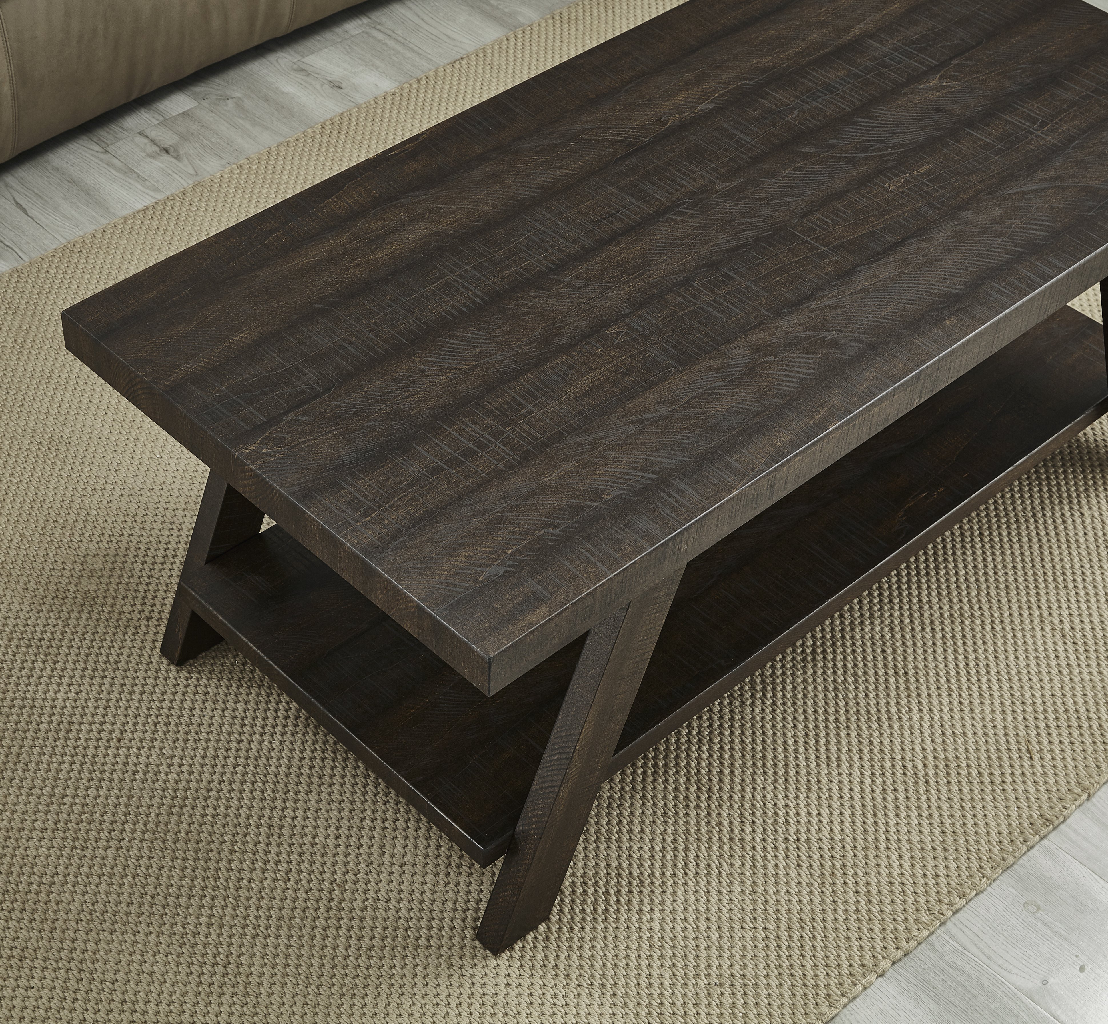 Rich espresso finished coffee table, features overextended rectangular top and a splayed-leg look