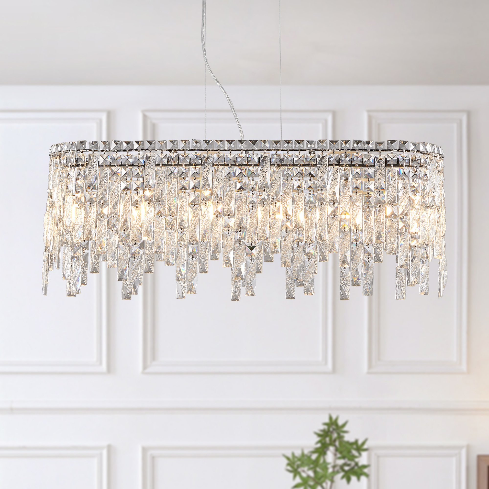 Silver Elegant Oval Crystal Chandelier, Modern Ceiling Light FixtureHigh-end luxury design: This chandelier is made of high-quality crystal and iron metal, emitting a brilliant glow that brings elegance and style to your home. Multi-purpose application: Modern oval design, suitable for a variety of places such as bedrooms, living rooms and dining rooms, to enhance the overall decorative effect. Stable and durable: Selected materials, strong and durable, to ensure long-term stability and safety, so that you have no worries. Easy installation: The detailed installation guide and all the installation accessories required make the installation process easy and quick, suitable for any home.
