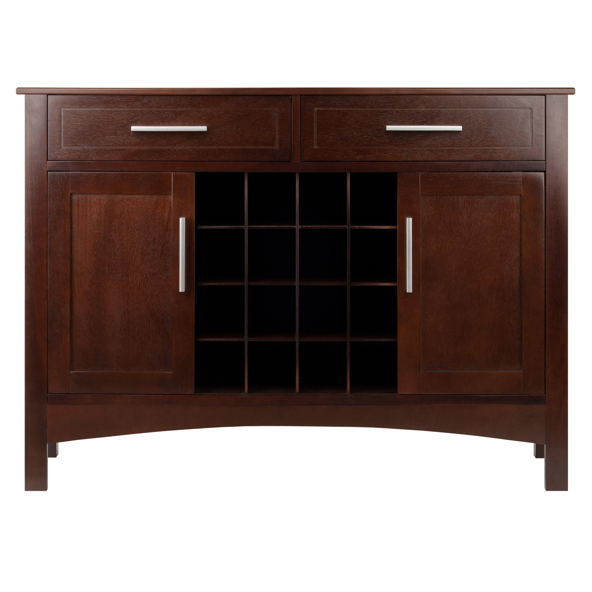 The contemporary-styled Winsome Wood Gordon Buffet Cabinet will show off your wines in style; while doubling as a sideboard or console table. Store your wine; glassware; and bar accessories in this handsome piece and still have plenty of tabletop space to prepare drinks and serve appetizers. A wood wine grid stores up to 16 bottles of wine but can easily be removed and used for additional storage or to display a decorative piece. Slide inward the two doors to expose the side cabinets which provide ample space to keep stemware; dishes; or additional wine and liquor bottles. Two wide drawers for accessories complete this ideal buffet for your dining room or den. The Gordon Buffet is constructed of sturdy solid and composite wood in a rich cappuccino finish; with modern matte-silver plastic cabinet handles. Conveniently packed and shipped in 1 box that includes the hardware necessary for assembling. Replacement parts can be requested directly to the manufacturer within 60 days from date of purchase.