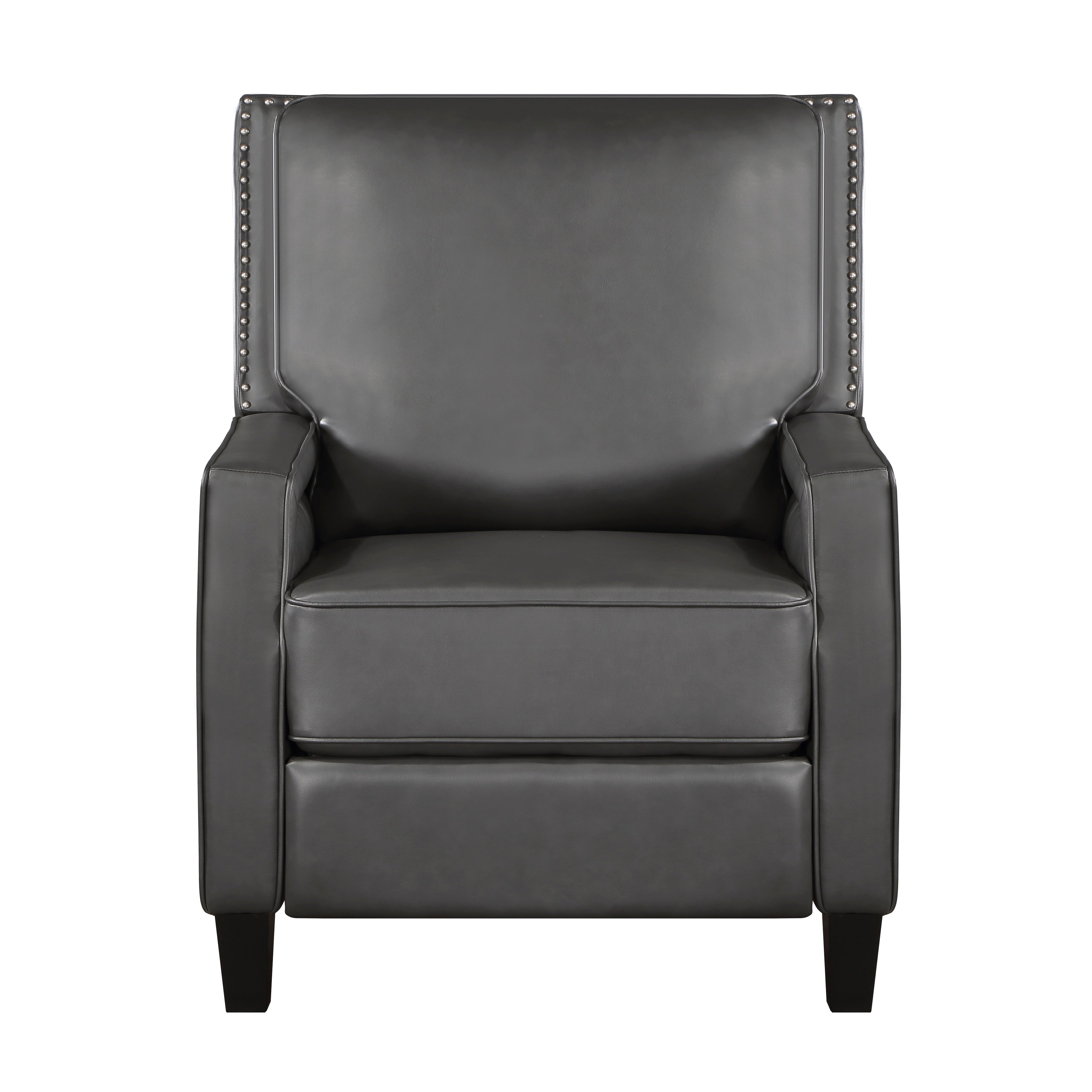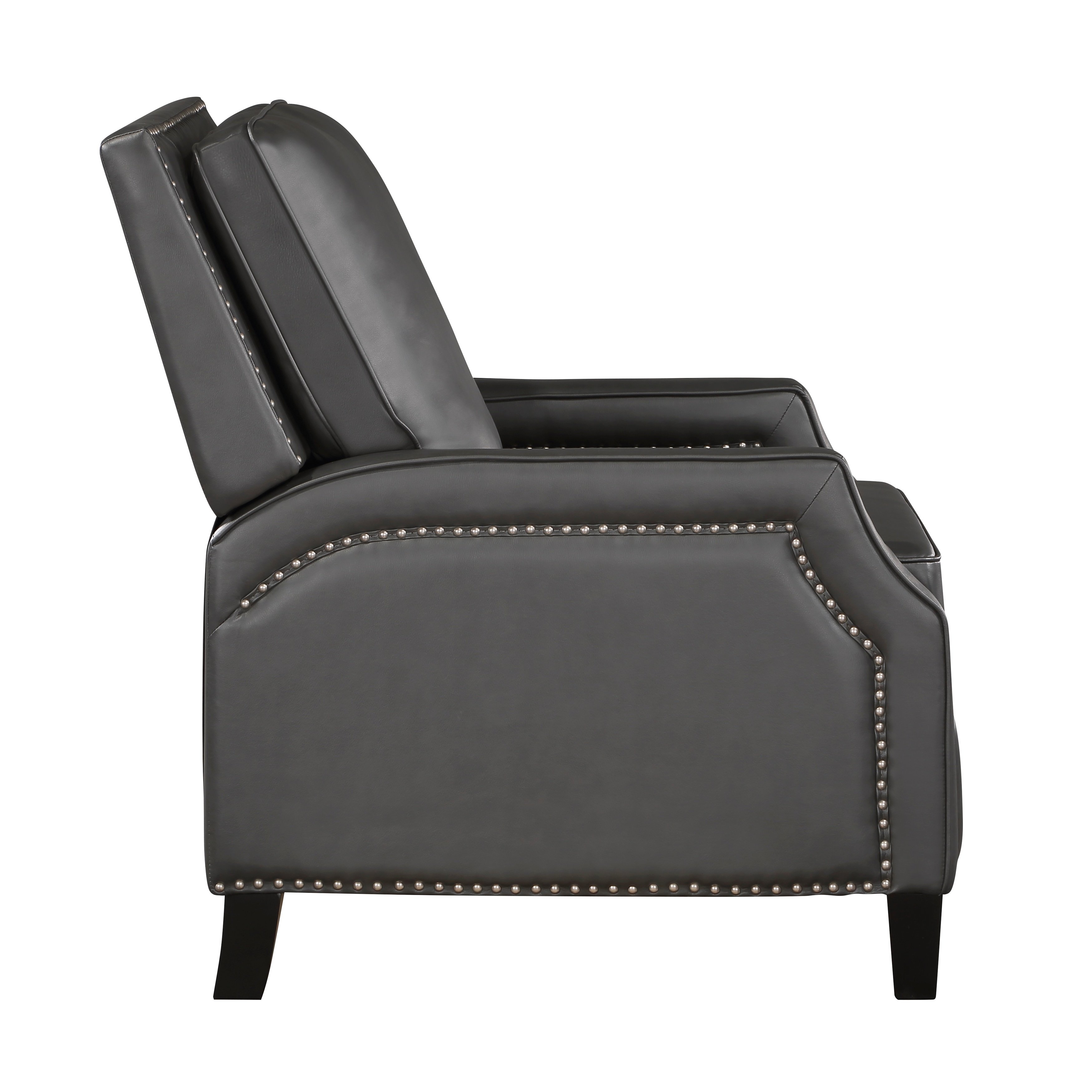 With a reclining mechanism that is engaged with your push, settling into the Berenson Collection is done so with ease. The tailored profile of the push back reclining chair is covered in gray faux leather and features nail head trim, lending to its transitional style, creating the perfect complement to your homes décor.