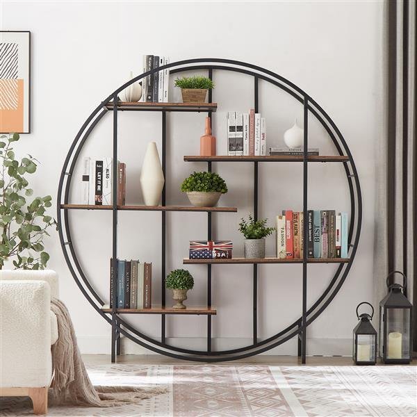 Sturdy Metal Frame Framed by sturdy metal tubes, ensuring sturdiness, stability and strengths for the bookshelves .High Quality Board High quality solid particleboard makes this bookshelf rack durable, waterproof, and easy to clean. Foot Pads Foot pads on the bottom of the shelf keep the floor scratch-free and provide anchors to prevent the shelf from tipping or shaking for added safety. Product Information Product Type Storage Rack Color Rustic Brown Material Particleboard, Steel Exterior Measurements67'' W x 11.8'' D x 67'' H (170 x 30 x 170 cm)Weight Capacity As shown Assembly Required About 50minNumber of packages1Package Contents1 x Storage rack, 1 x Assembly Kit, 1 x Instruction Vintage industrial style furniture made of high quality laminated wood with black iron frame for storage and display in living room, kitchen, office or bedroom .Effortlessly increase shelf space with this shelf with 6 open display shelves. Perfect for books, toys, photo frames, photo albums, dolls, flowers, plants, decorations, or kitchen utensils. Keep your home or office neat and organized. Foot pads on the bottom of the shelf keep the floor scratch-free and provide anchors to prevent the shelf from tipping or shaking for added safety. Blends with other furniture in the room to create a versatile space that suits your needs. •Simple structure, clear part number, simple installation steps and easier assembly.