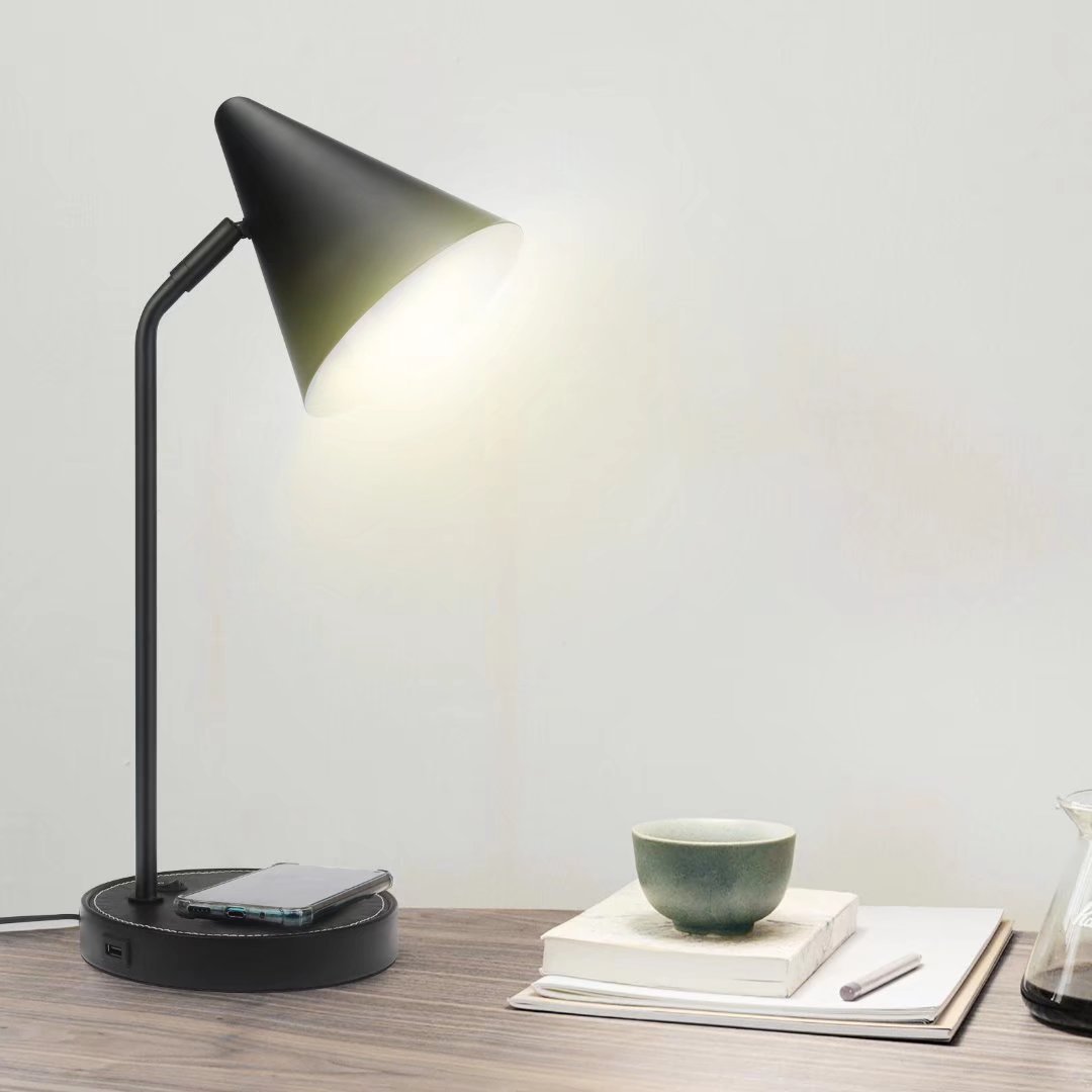 Modern in form and function this desk lamp is a must-have addition to your home office or living room side table. It's made from metal and features a circular base with a wireless charging platform where you can keep your devices fully charged and close by. A USB is located on the base and can charge up a second device simultaneously. The bended arm supports a cone adjustable metal shade that houses a 4W LED bulb (not included) that illuminates your reading nook in a soft glow. Conveniently located at the top of the base; the on/ off rocker switch operates this lamp. you will love how the light doesn't need to be on for the charging port to work.