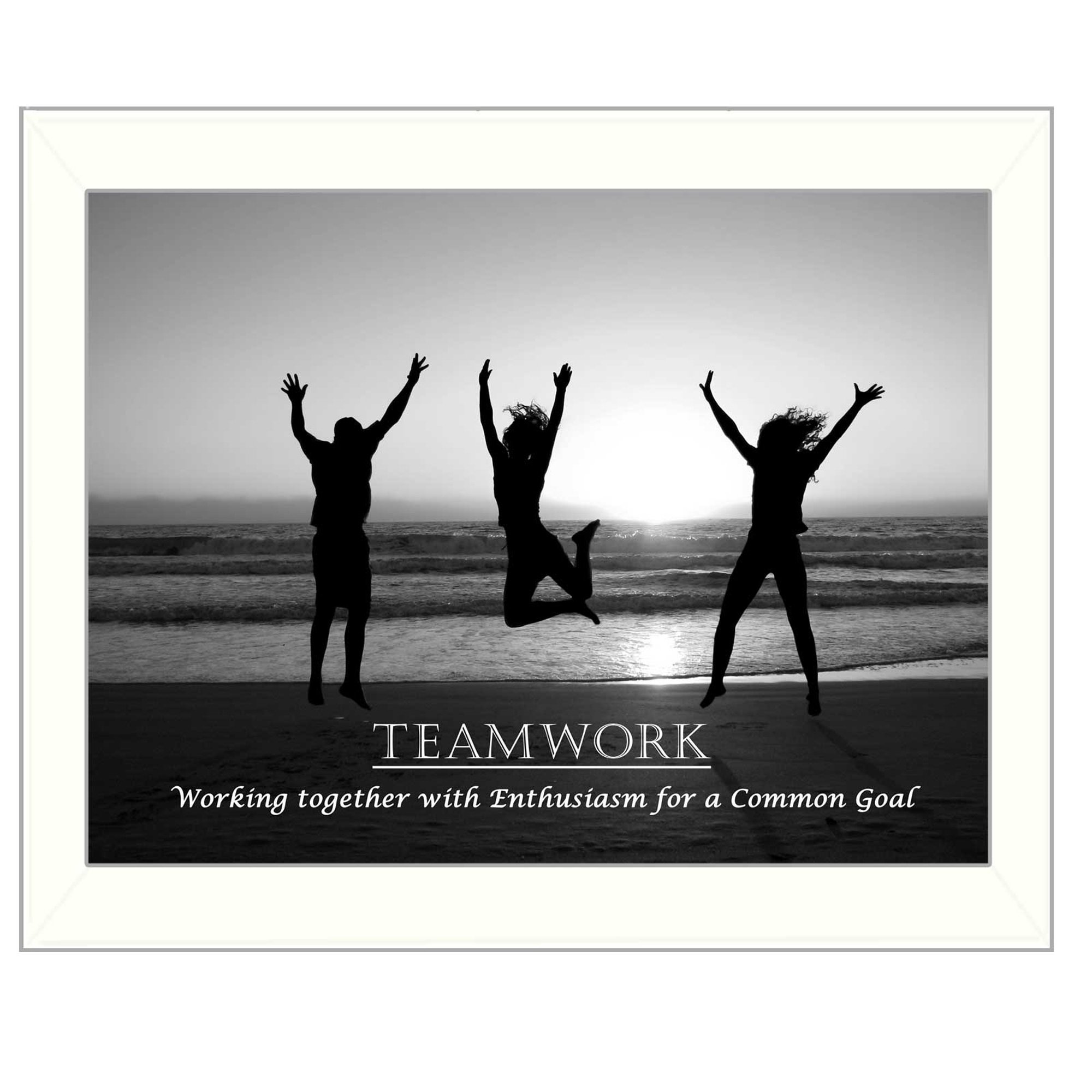 "Teamwork" is a 18" x 14" (grayscale) framed print. This is a picture of three people jumping on the beach and reads Teamwork is working together with enthusiasm for a common goal. This totally American Made wall decor item features an attractive frame, a textured canvas like finish so no glass is necessary and is ready to hang.•Women Owned (WBE)•Textured Artwork with a 'rolled on' acid free acrylic coating to create a canvas painting effect. No glass is necessary.•UV protectant coating protects artwork from fading.•MDF moulding adds natural beauty to the framed art. Frame is keyholed for ease of hanging.