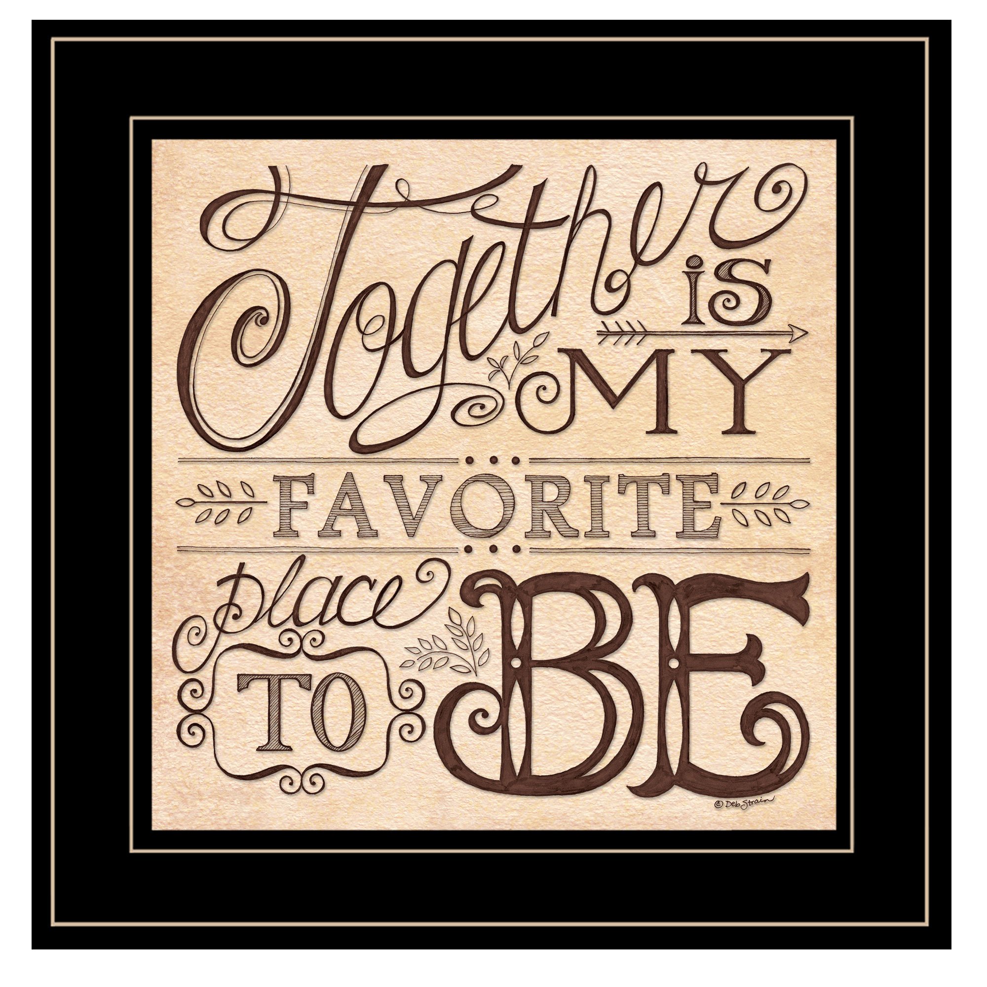DS673-704G Together, by Deb Strain. This decorative black framed 15x15 is a print of Love: Together is the Best Place to Be. Framed prints arrive ready to hang. •TEXTURED ARTWORK with a 'rolled on' acid-free acrylic coating to create a canvas painting effect.•UV PROTECTANT COATING protects artwork from fading. No glass is necessary.• MOULDING adds natural beauty to the framed art. Frame is keyholed for the easy hanging.•THIS FINE HOME DECOR piece made in the USA by Woman Owned Business (WBE) is a perfect gift for a friend or relative.