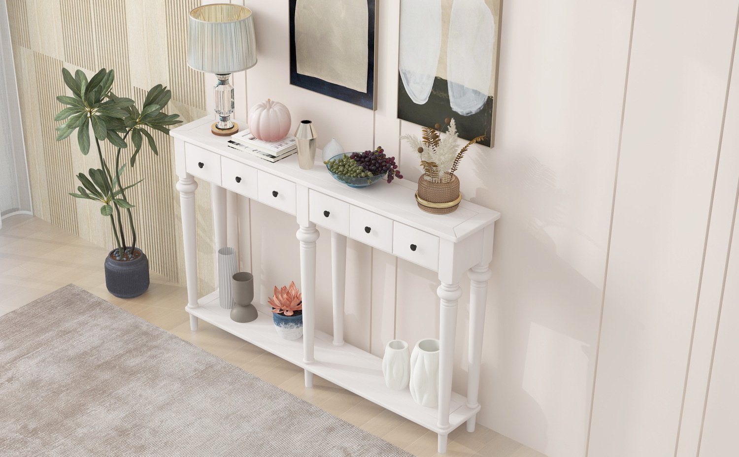 Vintage Charm: Featuring a rustic pine veneer finish and distressed glaze, this console table showcases vintage craftsmanship. Slim legs and four drawers bring traditional elegance, blending effortlessly into various interior styles. Available in 4 colors: old pine, white, navy blue and espresso.