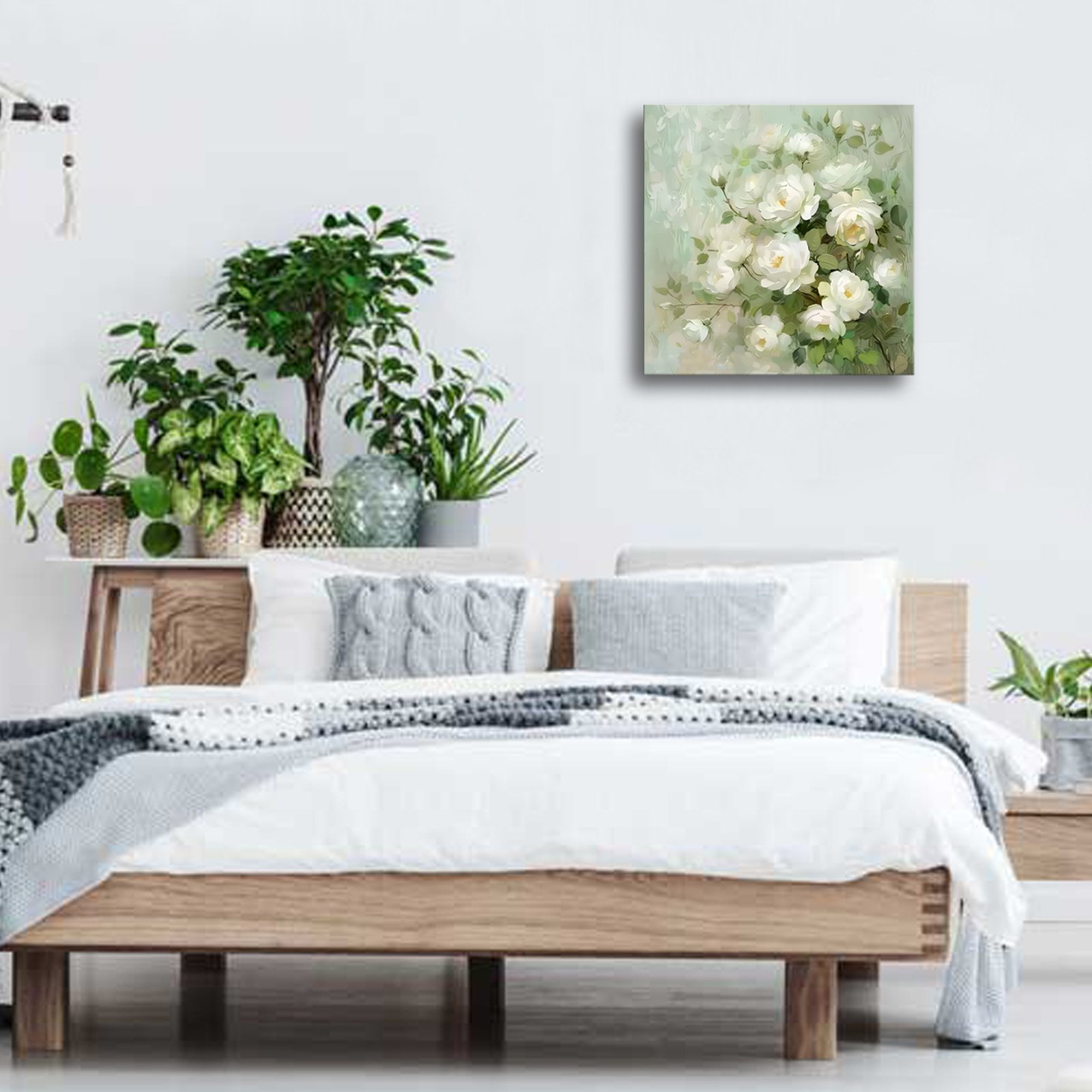 White Camellia Flower Wall Art, Floral Canvas Wall Art, White Blossom Green Leaf Painting